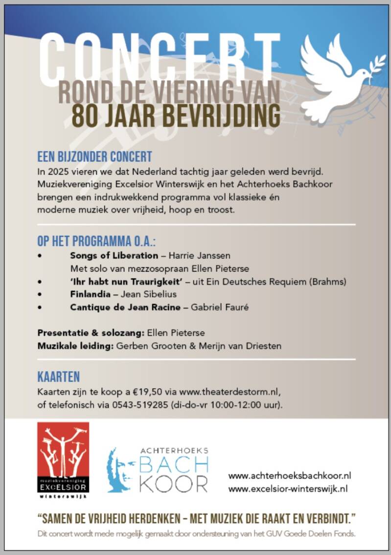 Ons meest recente concert, op 2 november 2025 in theater De Storm te Winterswijk, was een belevenis, zowel de samenwerking met muziekvereniging Excelsior als de uitvoering. Beide partijen hebben namelijk werk ingestudeerd dat voor hen niet gebruikelijk was. Desalniettemin is het een prachtig concert geworden en het publiek was enthousiast over het resultaat.